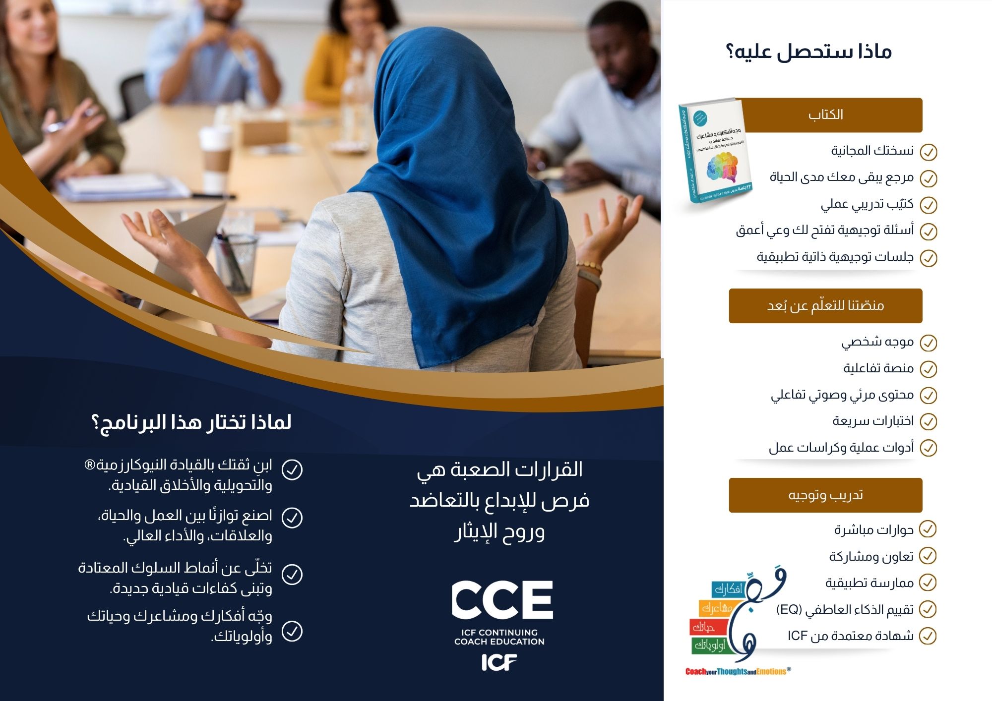 أتممت برنامج وجه أفكارك ومشاعرك واقترحه لكل كوتش لأنه برنامج عميق جداً ويوصلك إلى مرحلة الوعي بأفكارك ونسق تفكيرك وكيفية التعامل معها وكذلك بالنسبة للمشاعر يخليك تفهم المشاعر وكيف تعبر عنها بتقنيات بسيطه.